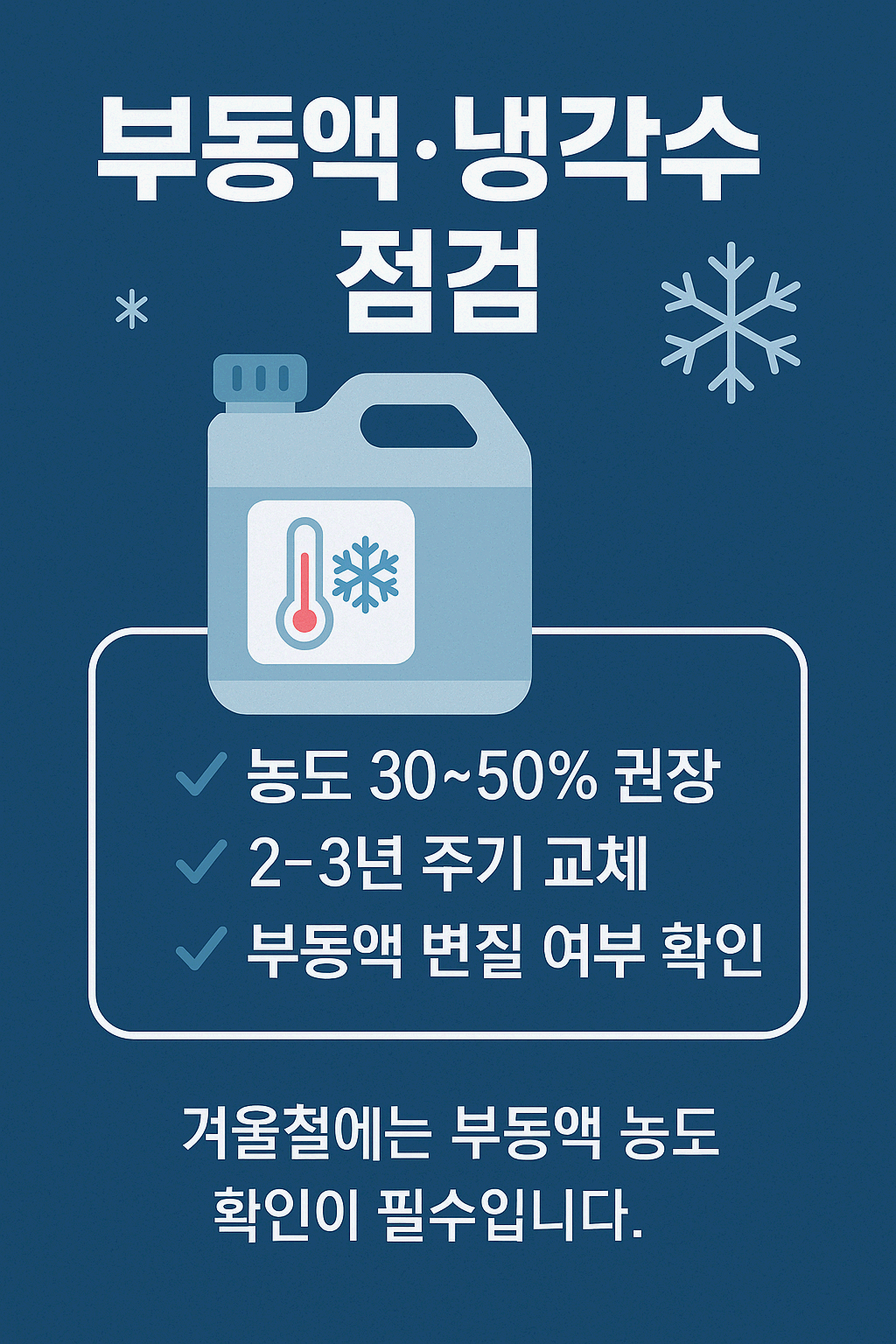 - 부동액 농도(정비 기준 약 30~50%)는 동결을 막는 핵심 요소로 반드시 확인해야 합니다.