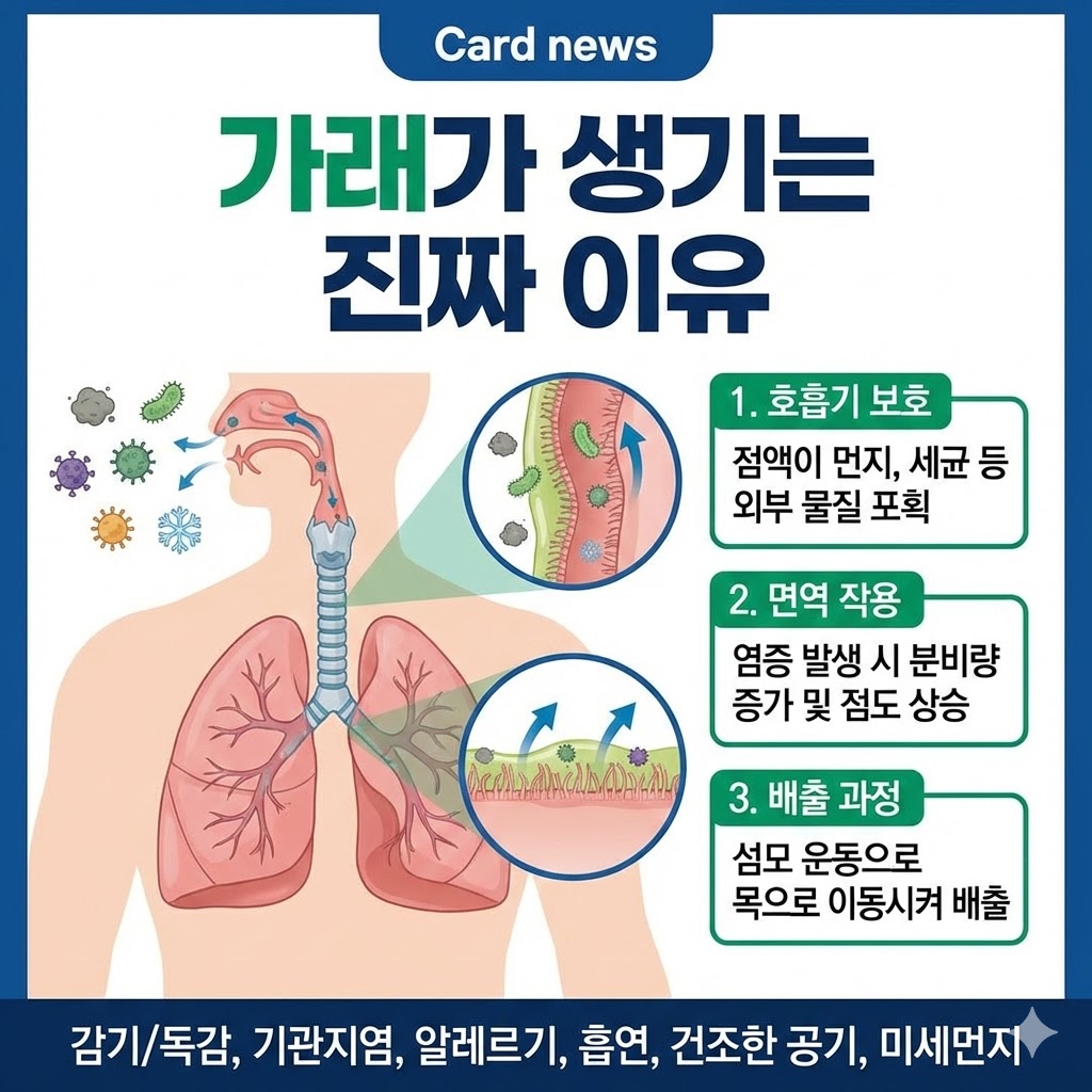 사실 가래(객담)는 우리 몸을 보호하기 위한 지극히 정상적인 분비물입니다. 기관지 점막을 보호하고 외부에서 들어온 먼지나 세균, 바이러스 등을 씻어내기 위해 만들어지죠. 평소에도 생성되지만, 우리는 이를 무의식적으로 삼키기 때문에 느끼지 못할 뿐입니다.