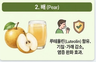 - 배: 루테올린 성분이 기침과 가래를 줄여주고 염증을 완화합니다. 도라지와 함께 즙을 내어 먹으면 궁합이 매우 좋습니다.