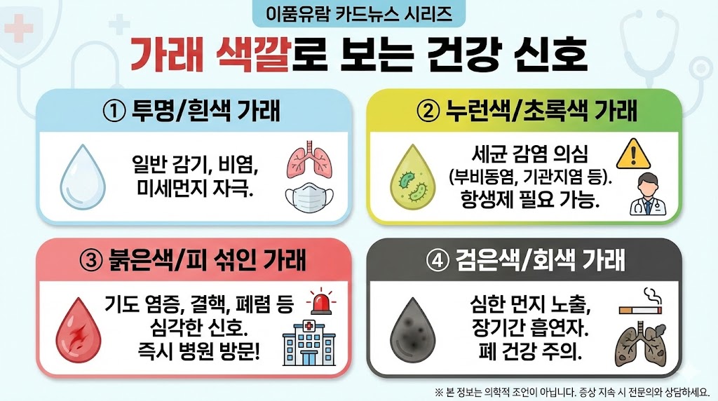 🚨 붉은색/피 섞임: 기도 염증, 결핵, 폐렴 등의 심각한 신호일 수 있으므로 즉시 병원 방문 필요.