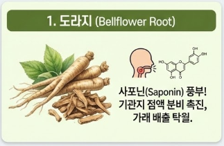 - 도라지: 사포닌 성분이 풍부하여 기관지 점액 분비를 촉진하고 가래를 삭히는 데 탁월합니다. 도라지청이나 차로 마시는 것이 좋습니다.