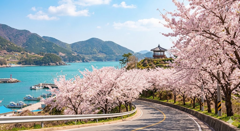 - 감상 포인트: 도로 한쪽으로는 짙푸른 바다가 넘실대고, 머리 위로는 벚꽃 터널이 햇빛을 가려주는 환상적인 드라이브 뷰를 선사합니다. 특히 일방통행 구간이 있어 차를 천천히 몰며 봄의 정취를 만끽하기에 더없이 좋습니다.