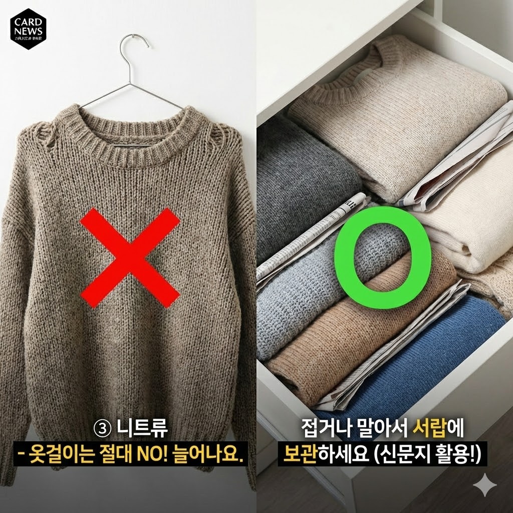 니트는 절대 옷걸이에 걸어서 보관하면 안 됩니다. 중력 때문에 어깨가 뿔처럼 튀어나오고 옷이 늘어나게 됩니다. 옷 사이에 얇은 종이나 습자지를 끼운 뒤 가볍게 돌돌 말거나 접어서 수납함에 보관하세요. 무거운 옷에 눌리지 않도록 수납장의 맨 위칸에 두는 것이 팁입니다.