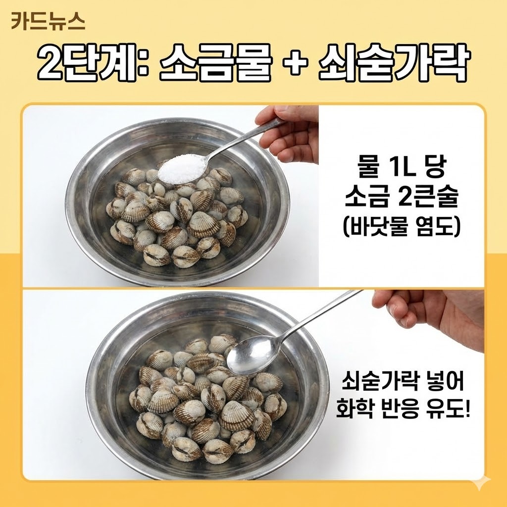 여기에 '쇠숟가락'을 하나 같이 넣어주세요! 숟가락의 성분과 소금물이 만나 화학 반응을 일으켜 꼬막이 이물질을 더 빨리 토해내게 만듭니다.