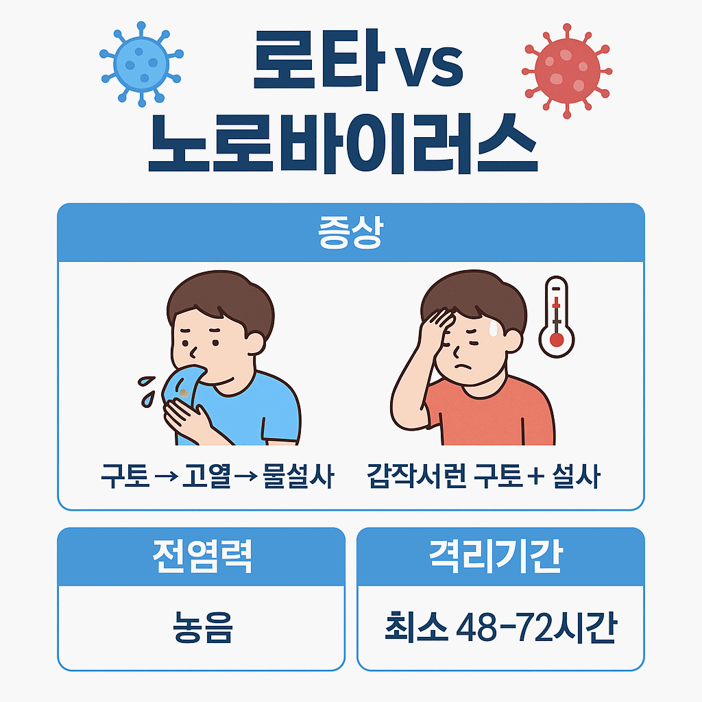 | 증상 특징 | 고열 + 물설사 증상 길게 | 급성 구토 + 단기간 설사 |