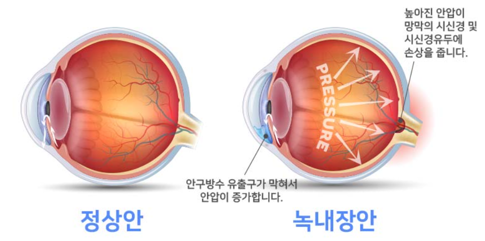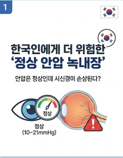 일반적으로 안압이 높으면(21mmHg 이상) 녹내장이 생긴다고 알려져 있습니다. 하지만 한국인은 안압이 정상 범위(10~21mmHg)임에도 불구하고 녹내장이 발생하는 '정상 안압 녹내장'의 비율이 압도적으로 높습니다.