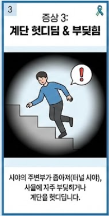 - 계단 헛디딤 & 부딪힘: 시야의 주변부가 좁아져(터널 시야), 걷다가 사물에 자주 부딪히거나 계단을 헛디딥니다.