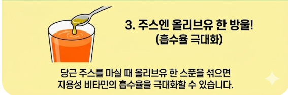 아침 대용으로 당근 주스를 갈아 드신다면, 착즙 후 올리브유 한 스푼을 떨어뜨려 섞어 마셔보세요. 지용성 비타민의 흡수율을 극대화할 수 있습니다.
