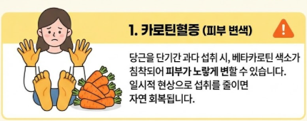- 카로틴혈증 (피부 변색): 당근을 단기간에 과도하게 섭취할 경우, 손바닥이나 발바닥, 심지어 얼굴 피부가 노랗게 혹은 주황빛으로 변하는 '카로틴혈증'이 나타날 수 있습니다. 이는 일시적인 현상으로 섭취량을 줄이면 자연스럽게 돌아옵니다.