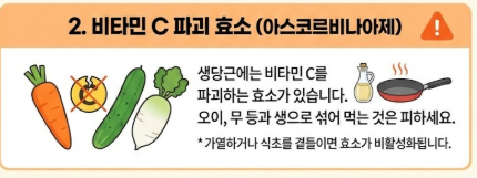 - 비타민 C 파괴 효소 (아스코르비나아제): 생당근에는 비타민 C를 파괴하는 효소가 들어있습니다. 따라서 오이나 무 등 비타민 C가 풍부한 채소와 생으로 섞어 먹는 것은 피하는 것이 좋습니다. 단, 가열하거나 식초를 곁들이면 이 효소의 활성이 사라집니다.