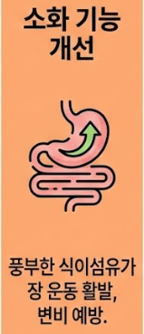 - 소화 기능 개선 및 변비 예방: 식이섬유가 풍부해 장 연동 운동을 활발하게 만들어 줍니다. 장내 유익균의 먹이가 되어 장 건강을 전반적으로 개선해 줍니다.