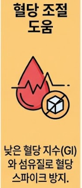 - 혈당 조절 도움: 천연 당분이 있지만, 혈당 지수(GI)가 낮고 섬유질이 풍부해 혈당이 급격히 상승하는 '혈당 스파이크'를 방지하는 데 도움을 줄 수 있습니다.+
