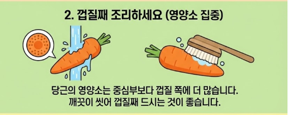 당근의 영양소는 중심부보다 껍질 쪽에 훨씬 집중되어 있습니다. 흐르는 물에 깨끗이 씻거나 전용 수세미로 겉면만 살짝 문질러 닦은 후 껍질째 드시는 것이 가장 좋습니다.