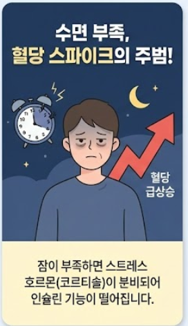많은 분들이 간과하는 것이 바로 '잠'입니다. 수면이 부족하면 우리 몸은 스트레스 호르몬인 코르티솔을 분비하는데, 이 호르몬이 인슐린의 기능을 떨어뜨려 혈당을 높입니다.