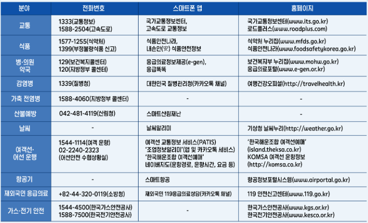 - 119 (구급상황관리센터): 24시간 응급환자 상담 및 현재 문을 연 병원/약국 실시간 안내