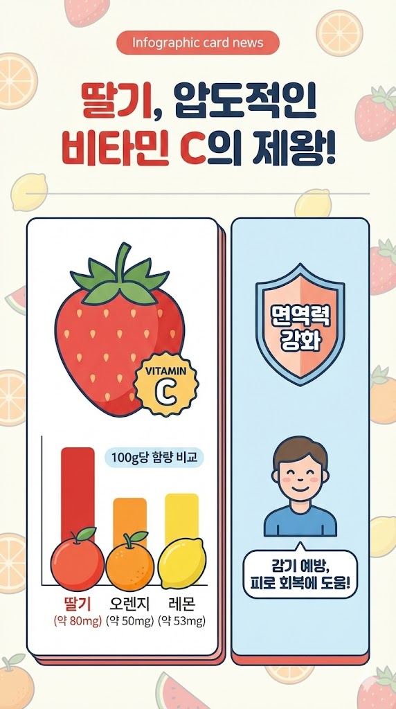 딸기의 가장 대표적인 성분은 단연 비타민 C입니다. 많은 분들이 비타민 C 하면 귤이나 오렌지를 떠올리지만, 실제 함유량을 비교해 보면 딸기가 훨씬 우수합니다.