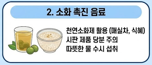 - 매실차와 식혜: 천연 소화제 역할을 하지만, 시판 제품은 당분이 높으니 주의하세요. 따뜻한 물을 수시로 마시는 것이 가장 좋습니다.