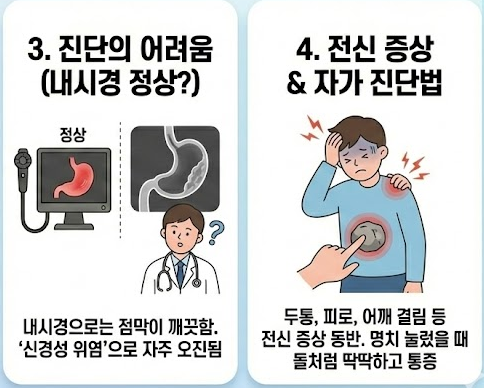 | 동반 증상 | 신트림, 구역질, 식욕 부진 | 두통, 만성 피로, 어지럼증, 불면증, 전신 근육통 등 전신 증상 동반 |