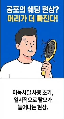 미녹시딜 사용 초기에 많은 분들이 포기하게 만드는 주범, 바로 '쉐딩(Shedding) 현상'입니다. 약을 바르고 2주~6주 사이에 평소보다 머리카락이 더 많이 빠지는 것을 경험하게 되는데요.