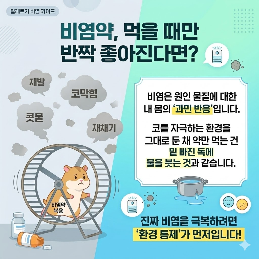 비염 약(항히스타민제 등)은 이 과민 반응을 일시적으로 눌러주는 역할을 할 뿐, 내 몸의 면역 체계 자체를 바꾸거나 환경에 있는 원인 물질을 없애주지는 못합니다. 따라서 약에만 의존하게 되면 '증상 완화 -> 약 중단 -> 재발'의 무한 굴레에 빠지게 됩니다. 진정으로 비염 뿌리를 뽑으려면, 내 몸이 원인 물질에 덜 예민하게 반응하도록 면역력을 정상화하고, 원인 물질 자체를 차단하는 환경 통제가 동시에 이루어져야 합니다. 기초 공사 없이 지붕만 계속 수리하는 격이 되지 않도록 관점의 전환이 필요합니다.