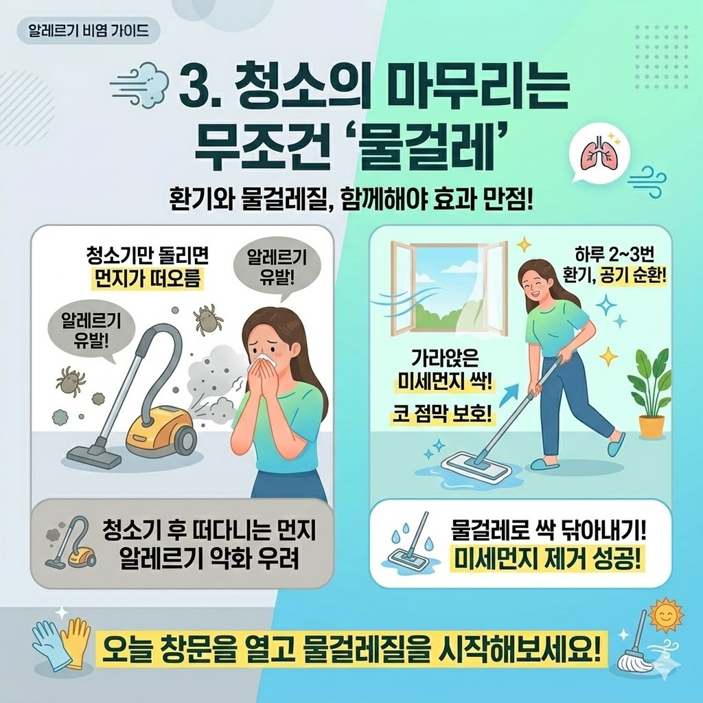 - 주기적인 환기와 청소: 미세먼지가 심한 날을 제외하고는 하루 2~3번, 짧게라도 환기를 시켜 실내 공기를 순환시켜야 합니다. 청소할 때는 진공청소기 사용 후 반드시 물걸레질을 하여 가라앉은 미세 먼지까지 닦아내는 것이 중요합니다.