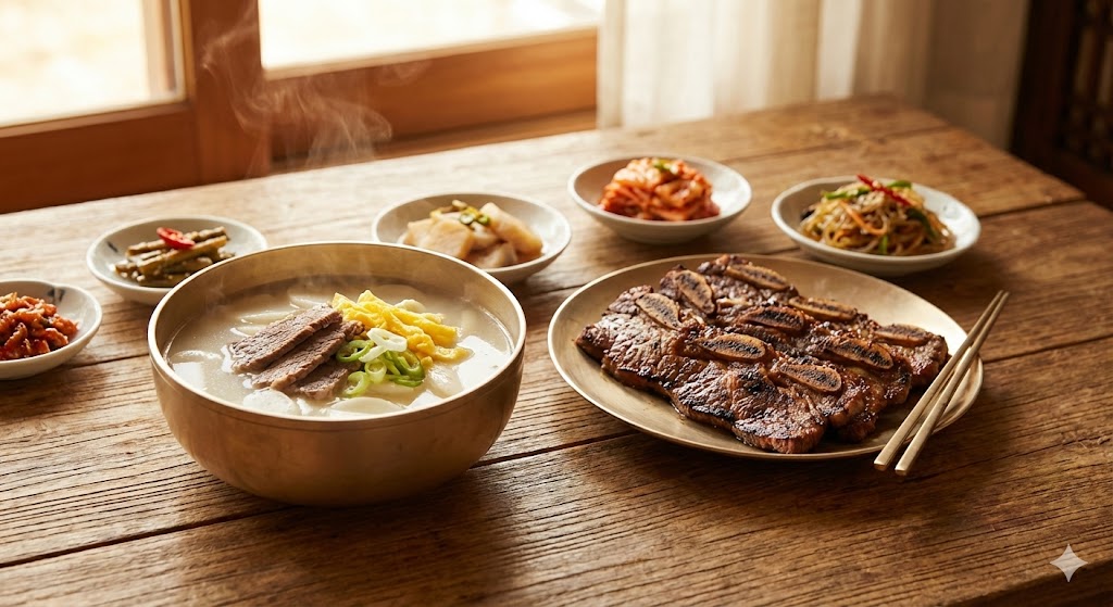 - 아침: 맑은 소고기 떡국 + 나박김치 + 시금치, 고사리 등 기본 나물 3종
