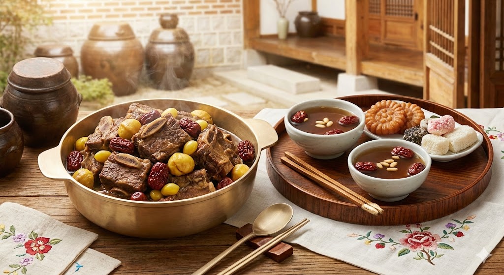 * Tip: 8인분 갈비찜은 압력솥을 활용하면 고기를 훨씬 부드럽게 찌면서 시간도 절약할 수 있습니다. 소화가 잘되는 따뜻한 대추차를 식후에 내어보세요.