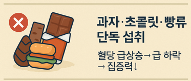 ❌ 달콤한 빵 + 초코우유 혈당 급상승 → 급 하락 국어 끝나고 멍해짐