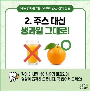 - 골든 타임 지키기: 과일은 식후 디저트로 드시면 절대 안 됩니다! 식후에 밥(탄수화물)과 함께 과일이 소화되면 혈당이 이중으로 폭발합니다. 과일은 식전 30분이나, 식사와 식사 사이 오후 간식 시간에 허기를 달래는 용도로 소량만 드시는 것이 가장 좋습니다.