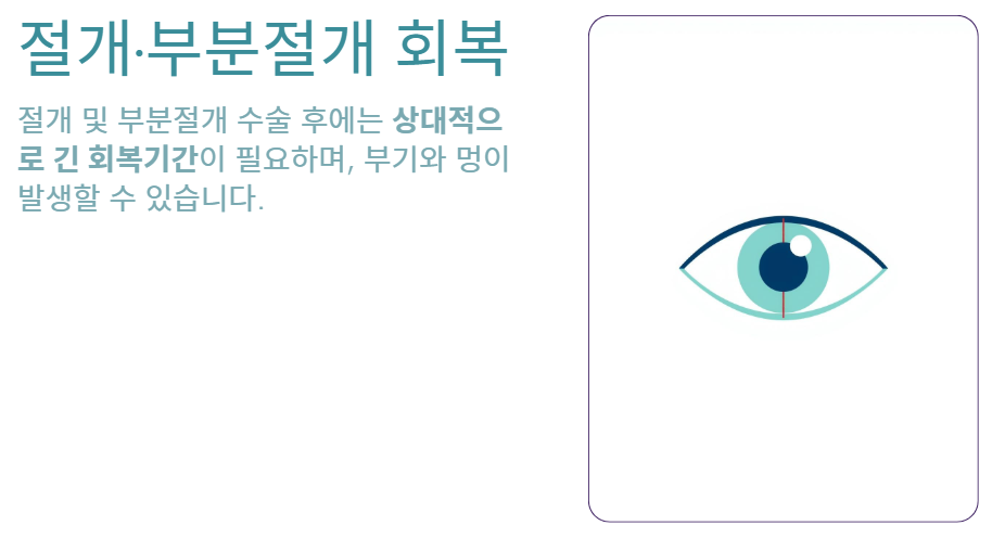 - 절개·부분절개는 눈 주위가 부어오르고 당김 느낌 강함