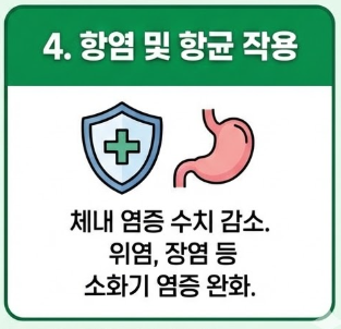 체내 염증 수치를 낮추는 항염 작용이 뛰어나 위염, 장염 등 소화기 계통의 염증 완화에 도움을 줍니다. 또한 눈의 충혈을 가라앉히고 시야를 맑게 하는 데에도 일정 부분 기여한다고 알려져 있습니다.