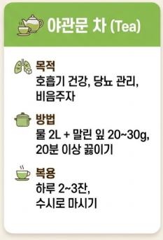 호흡기 건강이나 당뇨 관리, 혹은 술을 못 드시는 분들은 차로 끓여 드시는 것이 좋습니다. 물 2L에 말린 야관문 20~30g 정도를 넣고 20분 이상 끓여서 수시로 마십니다. 맛은 쌉싸름하면서도 구수한 편입니다.