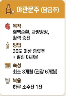 혈액순환과 자양강장이 목적이라면 술로 담가 드시는 것이 유리합니다. 야관문의 유효 성분은 알코올에서 추출 효율이 높기 때문입니다. 30도 이상의 증류주에 말린 야관문을 넣고 최소 3개월(권장 6개월) 이상 숙성시킨 후, 하루 소주잔 1잔 정도를 약술로 드시는 것이 좋습니다.