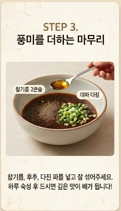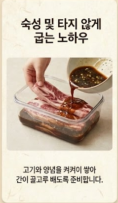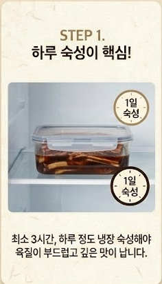 - 숙성 시간: 최소 3시간 이상 냉장 숙성을 권장하며, 하루 정도 숙성했을 때 가장 맛이 깊고 육질이 부드러워집니다.
