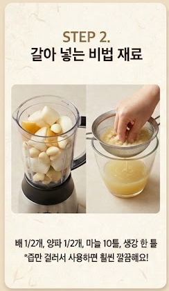 배와 양파는 믹서기에 갈아서 면보나 체에 걸러 즙만 사용하는 것이 깔끔합니다. 건더기를 그대로 넣으면 고기를 구울 때 양념이 쉽게 타버리기 때문입니다. 만약 배가 비싸거나 없다면 '배 음료(IdH)'를 활용하는 것도 자취생 꿀팁 중 하나입니다.