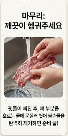 - 세척: 핏물이 빠진 고기는 뼈 부분을 흐르는 물에 문질러 씻어 뼛가루를 완벽히 제거해 줍니다.