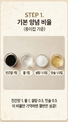 - 기본 양념: 진간장 1컵(200ml), 물 1컵, 설탕 1/2컵, 맛술 1/2컵
