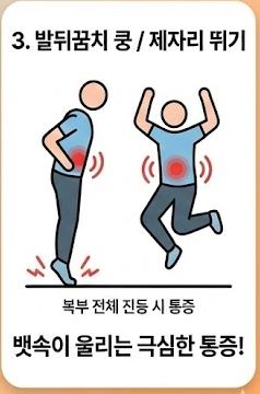 - 발뒤꿈치 들기(까치발) 쿵 떨어뜨리기: 제자리에서 까치발을 들었다가 발뒤꿈치를 바닥에 '쿵' 하고 강하게 떨어뜨려 봅니다. 혹은 제자리 뛰기를 해봅니다. 이때 복부 전체나 오른쪽 아랫배에 뱃속이 울리는 듯한 극심한 통증이 발생한다면 충수염이나 복막염의 신호일 수 있습니다.