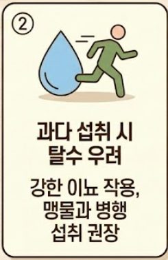 - 탈수 증상: 강력한 이뇨 작용으로 인해 소변 배출이 잦아질 수 있습니다. 땀을 많이 흘리는 여름철이나 운동 직후에는 맹물과 병행하여 섭취하는 것이 안전합니다.