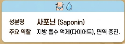 | 사포닌 | 지방 흡수 억제(다이어트), 면역 증진 |
