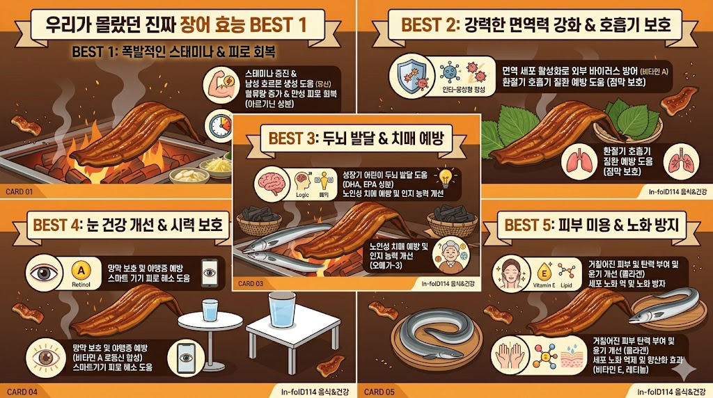 장어가 단순히 힘을 나게 해주는 것을 넘어서 우리 몸 구석구석 어떤 긍정적인 변화를 가져다주는지 구체적인 효능 5가지를 정리해 드릴게요.