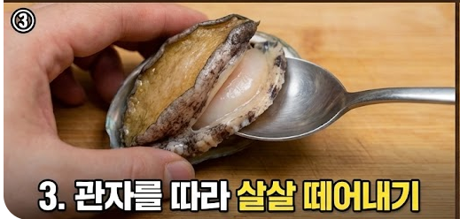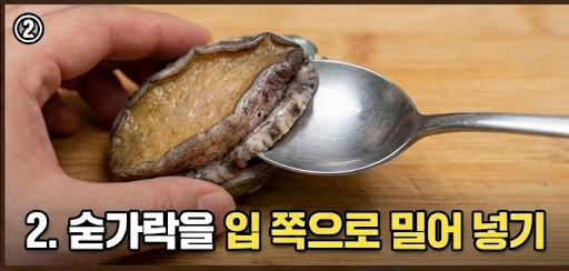 1. 전복의 얇은 쪽(입 부분) 껍질과 살 사이에 숟가락을 뒤집어서 밀어 넣습니다.