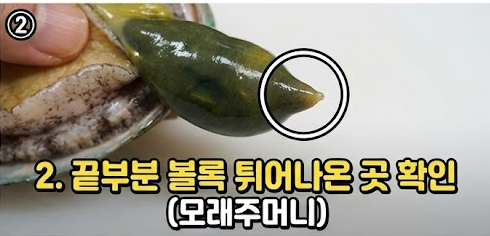내장 손질법: 내장의 볼록 튀어나온 부분 끝을 보면 약간 뾰족하게 튀어나온 부위가 있는데, 이것이 모래주머니입니다. 칼로 이 부분만 살짝 도려내 줍니다. 자연산 전복일수록 모래가 많으니 꼭 제거해 주세요.