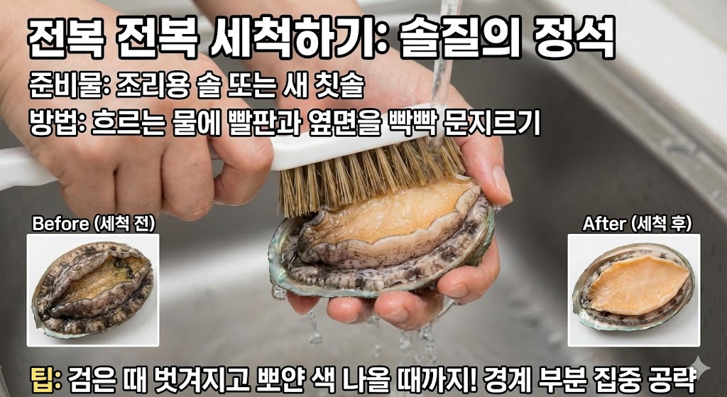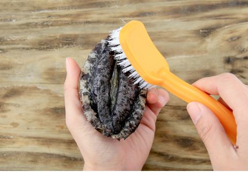 • 방법: 흐르는 물에서 솔을 이용해 전복의 빨판(바닥면)과 옆면의 주름진 부분을 빡빡 문질러 줍니다.