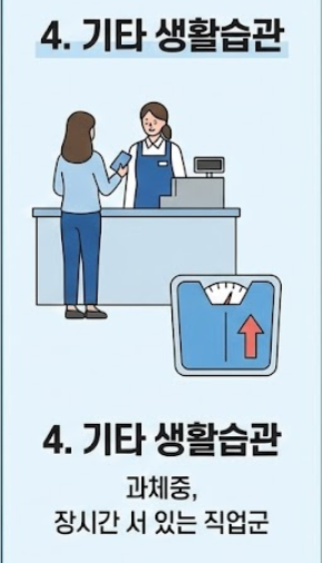 - 기타: 과체중으로 인해 발바닥이 견뎌야 할 하중이 늘어난 경우, 서비스직 등 장시간 서서 일하는 직업군