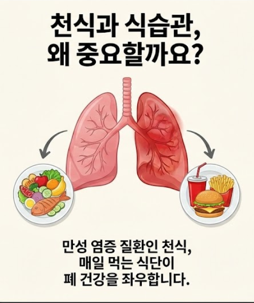 작은 식습관의 변화가 건강한 폐를 만드는 첫걸음입니다. 오늘 저녁 식탁에는 등푸른 생선구이와 따뜻한 도라지차 한 잔 어떠신가요?