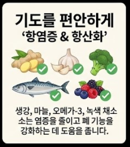 천식은 완치보다는 '관리'의 개념으로 접근해야 하는 질환입니다. 오늘 소개해 드린 생강, 도라지, 오메가-3, 물 등을 식단에 꾸준히 포함시키고, 찬 바람이나 미세먼지 같은 환경적 요인을 피하신다면 훨씬 더 편안한 호흡을 되찾으실 수 있을 거예요.