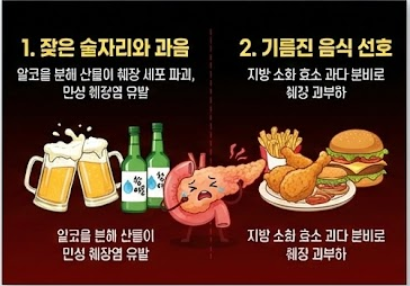 • 과도한 음주: 알코올은 췌장에서 분해되면서 독성 물질을 만들어 세포를 파괴합니다. 만성 췌장염의 가장 큰 원인입니다.