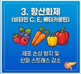 무작정 좋다는 음식을 먹기보다, 췌장이 필요로 하는 영양소가 무엇인지 아는 것이 중요합니다. 췌장은 염증에 취약하고 산화 스트레스에 약합니다. 따라서 항산화 성분(플라보노이드, 베타카로틴)항염증 물질이 풍부한 식단이 필수적입니다.