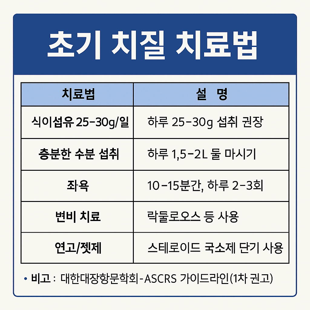 치질 치료는 증상·등급에 따라 단계적으로 진행됩니다.